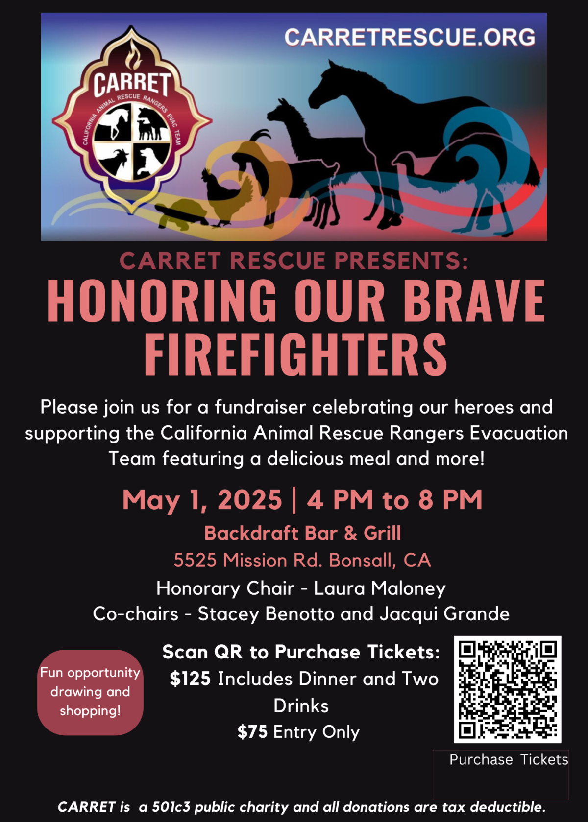 Visit CARRET at our tent at the San Marcos Wildfire Preparedness Fair. Learn about our services and how CARRET, a 501c3 Non-Profit, provides emergency evacuation support for horses, livestock and exotic animals!